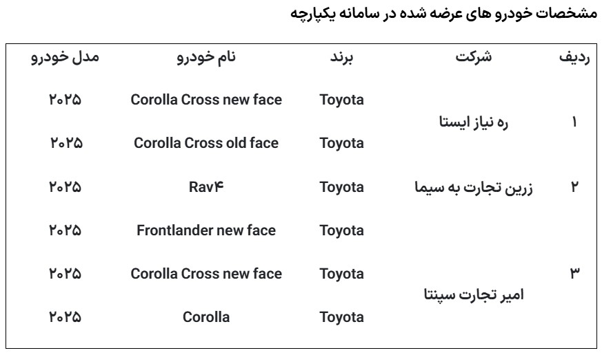 خودروهای عرضهشده در این مرحله شامل محصولات متنوعی از برندهای معتبر جهانی است که مشخصات آنها به شرح زیر اعلام شده است: